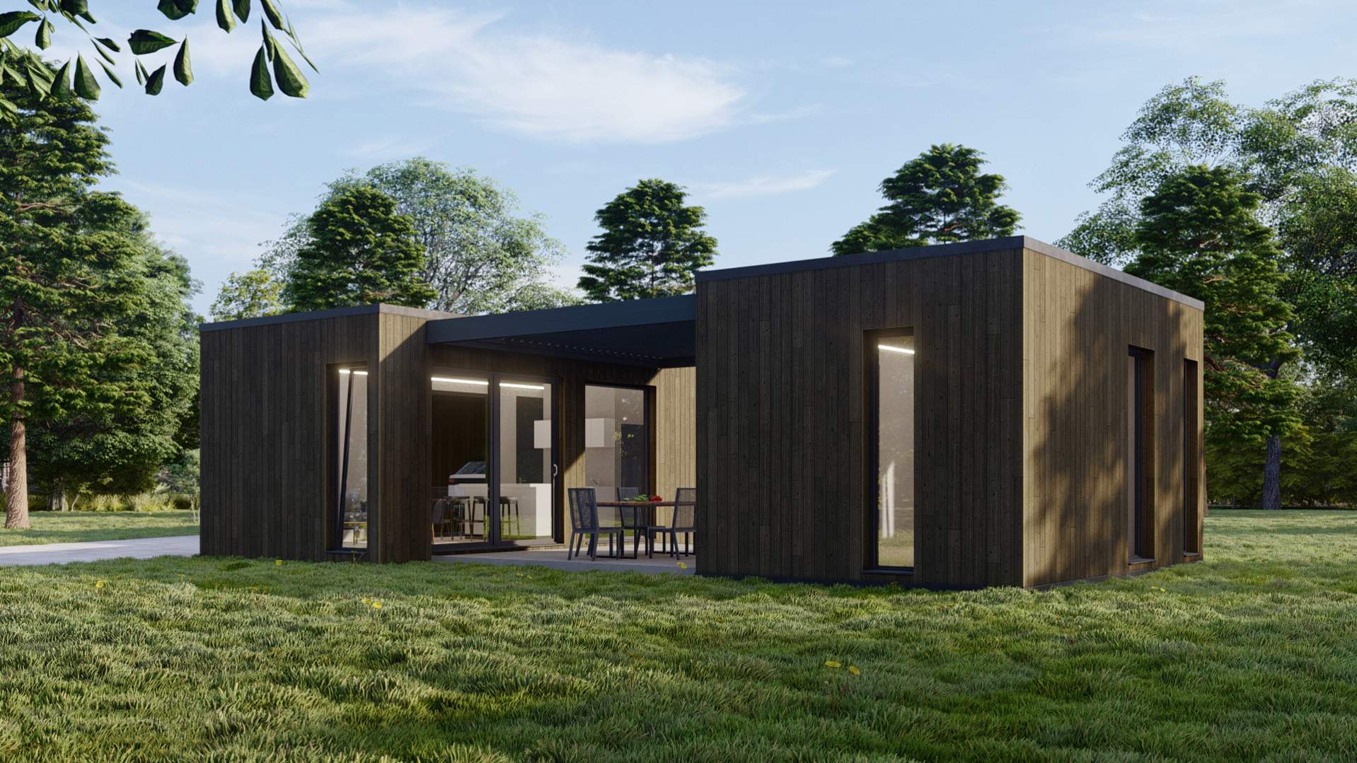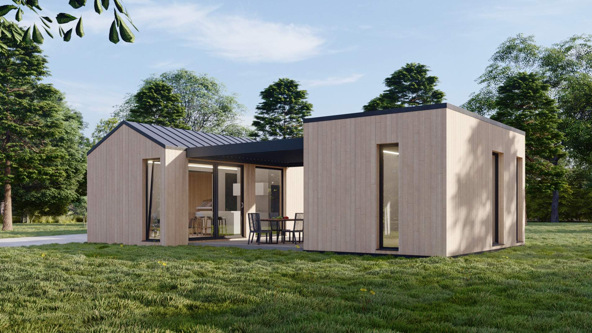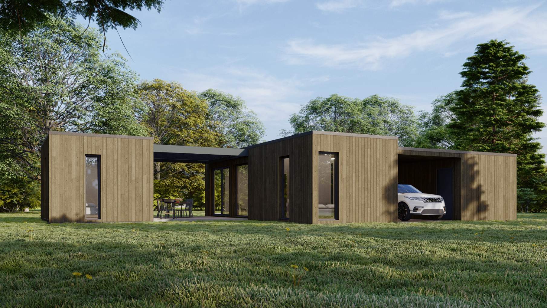 Rozsáhlá varianta domu v dispozici až 4+KK s garáží a zastřešeným stáním dělá svojí členitostí z projektu atypickou stavbu, které si nelze nevšimnout. Přidaná jednotka 1+KK s vlastní kuchyní a koupelnou dodává mobilnímu bydlení nový rozměr.